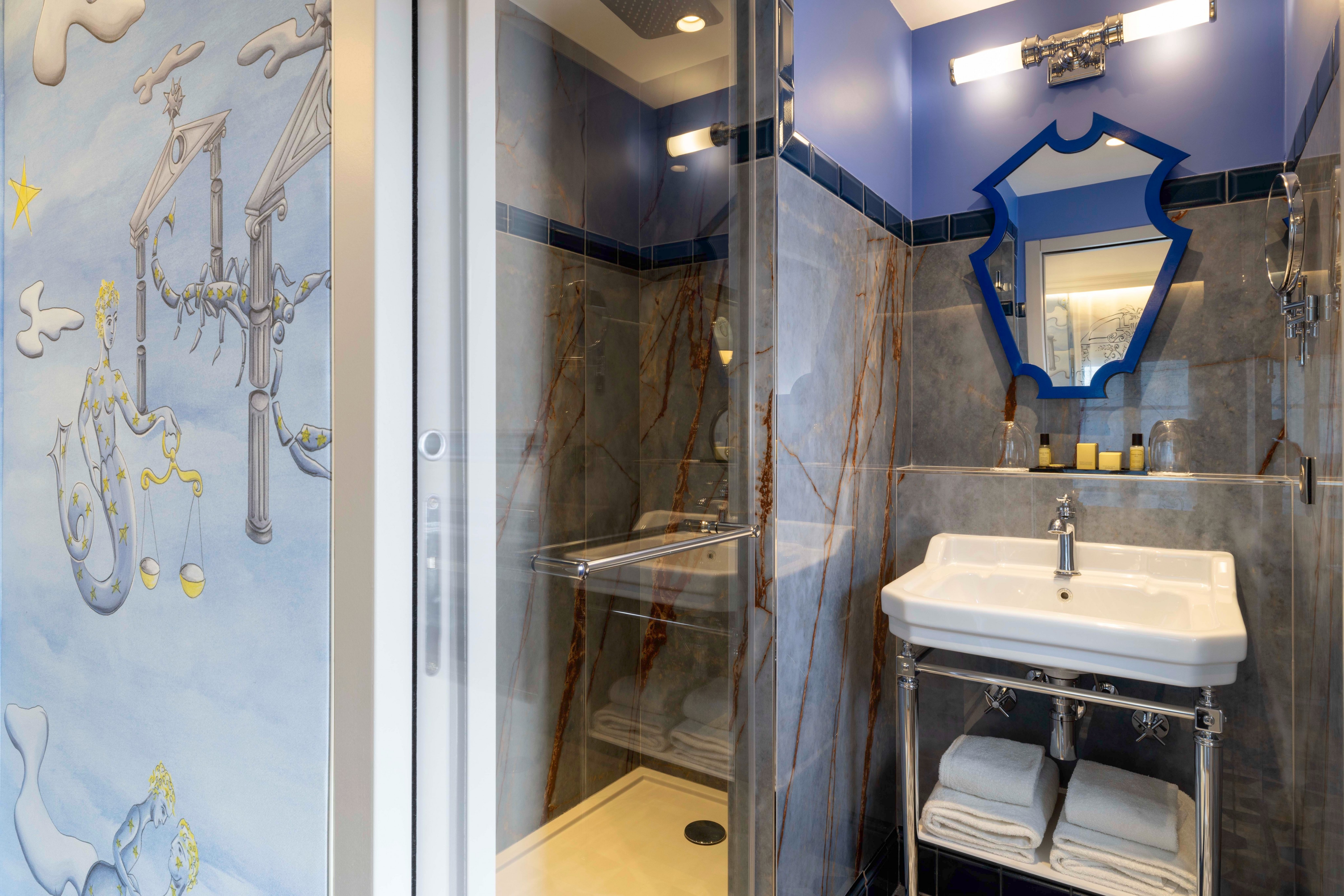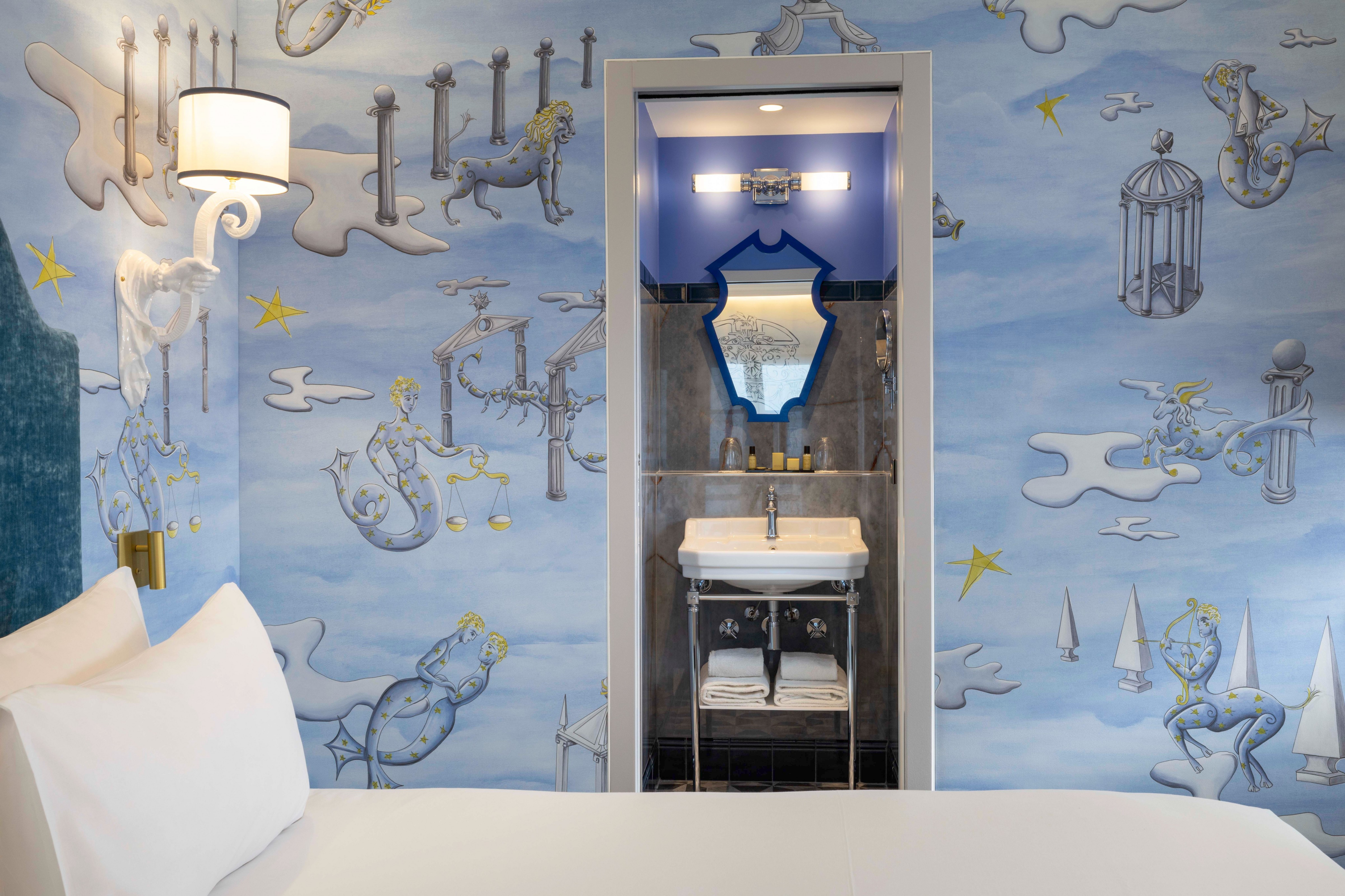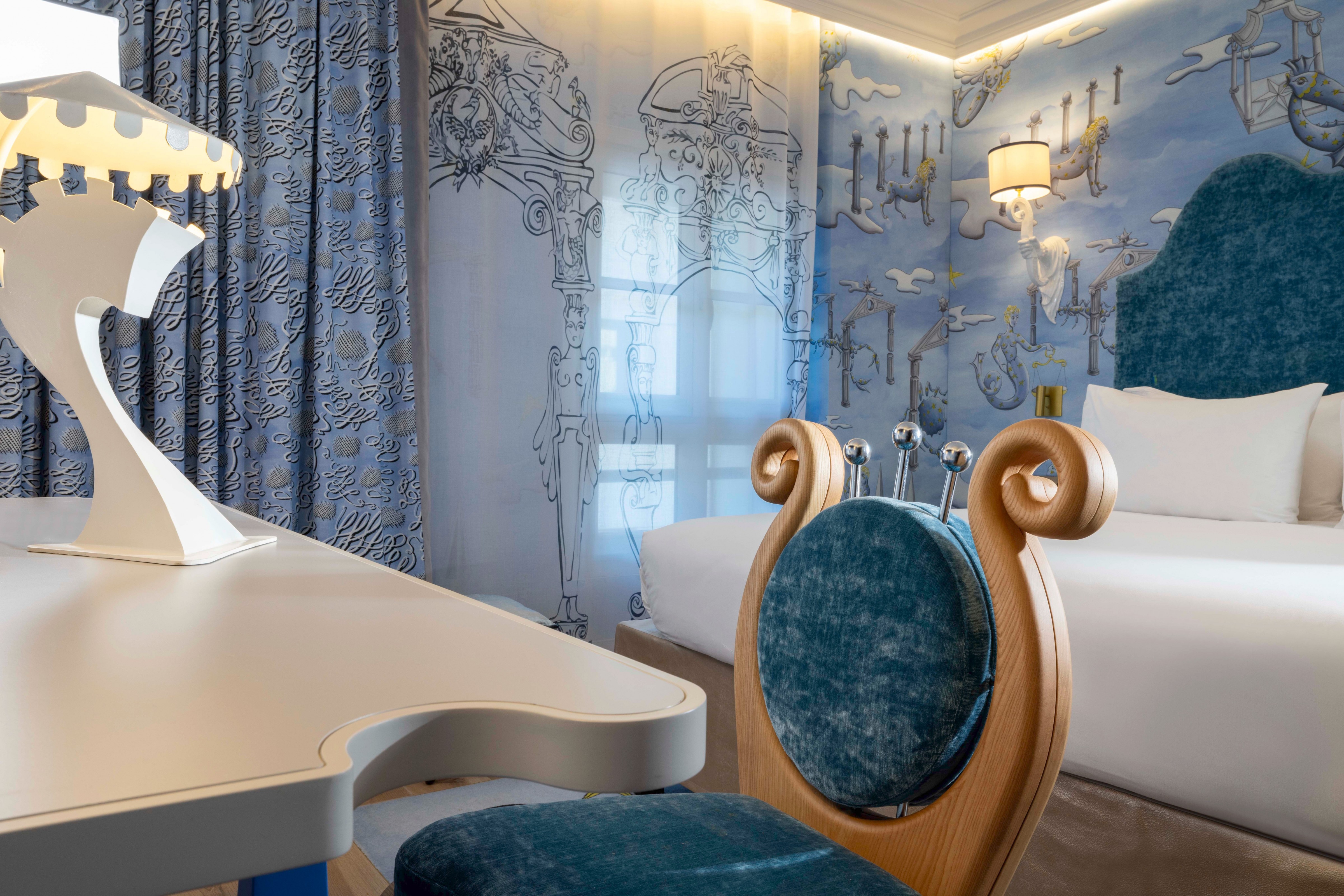 Das Zimmer „Découverte“ ist eine echte künstlerische Oase, die von Vincent Darré entworfen wurde. Seine traumhafte Welt, in der sich kühne Linien, lebhafte Farben und raffinierte Details vermischen, schafft eine einzigartige und inspirierende Atmosphäre.